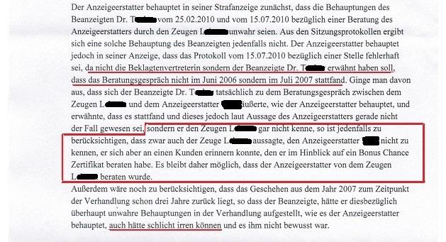 "Beide Zeugen, Anzeigeerstatter und Zeuge L sagen übereinstimmend aus, sich nicht zu kennen. Der Zeuge L sagt jedoch aus, sich an einen Kunden erinnern zu können, den er zu einem Zertifikat beraten habe. Es bleibt daher möglich, dass der erinnerte Beratene der