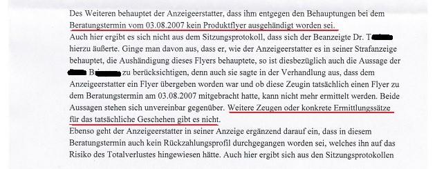 Dieser Satz findet sich wörtlich genau auch im Bescheid zur Einstellung des Verfahrens gegen die Beraterin B und ist deshalb genauso falsch. Auch dieser Staatsanwalt täuscht mit seiner absurden "Begründung" völlige Unkenntnis des Begriffs des hinreichenden Tatverdachts vor und begründet mit seinem Verhalten den Verdacht auf vorsätzliche Ermittlungsverweigerung.