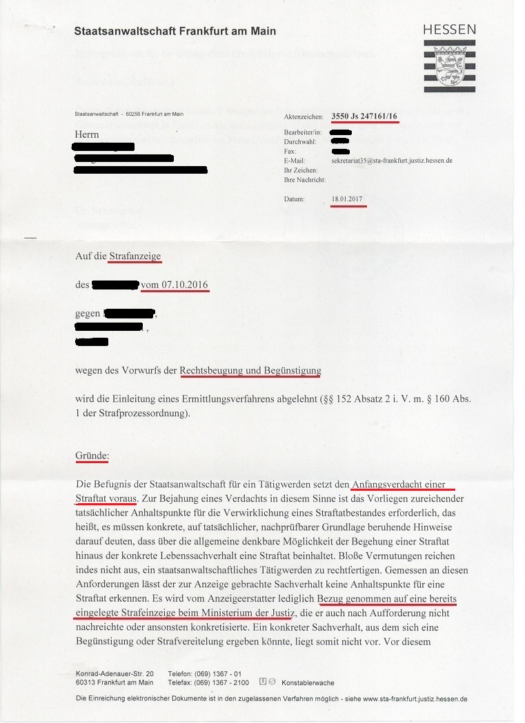 In der folgenden Ermittlungsablehnung macht die Staatsanwaltschaft Frankfurt am Main aus einer Sachstandsanfrage vom 07.10.2016 eine Strafanzeige gegen drei Frankfurter OLG-Richter*innen. Meine Sachstandsanfrage bezog sich auf vier Strafanzeigen, die ich mit Schreiben vom 19.02.2016 an das hessische Justizministerium (HMdJ) gerichtet hatte. Das HMdJ hat ihren Eingang mit Schreiben vom 03.03.2016 bestätigt und sie am selben Tag fristgerecht an die Staatsanwaltschaft Frankfurt am Main weitergeleitet. Eine dieser vier Strafanzeigen war die gegen drei Frankfurter OLG-Richter*innen wegen Rechtsbeugung und Begünstigung in ihrem Abweisungsbeschluss vom 08.06.2011 gegen einen Berufungsantrag. Die angezeigten Tatbestände waren jedoch nach fünf Jahren am 08.06.2016 bereits verjährt. Diese Tatsache indiziert für mich ganz eindeutig den unzulässigen Versuch, Verfolgungsverjährung der am 19.02.2016 angezeigten und erst am 08.06.2016 verjährten Tatbestände aus dieser Strafanzeige zu konstruieren.