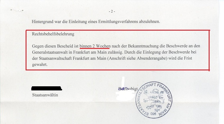 Und so kann es nach dem Bescheid vom 18.01.2017 nur eine Beschwerde vom 28.01.2017 per Einschreiben mit Rückschein an die Generalstaatsanwaltschaft Frankfurt am Main geben.