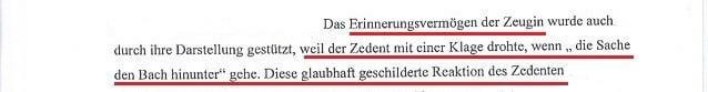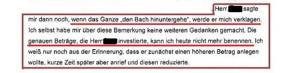 Doch in dem oben gezeigten Auszug der protokollierten Zeugenaussage heißt es: Die genauen Beträge, die der Zedent investierte, kann ich heute nicht mehr benennen
