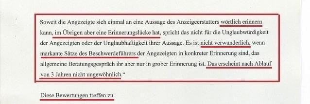 ... und schließlich von der Generalstaatsanwaltschaft in einer Beschwerdeabweisung mit der Erklärung von teilweisen "Erinnerungslücken" (hinsichtlich des "allgemeinen Beratungsgesprächs") und teilweise "konkreter Erinnerung" (hinsichtlich eines einzelnen, frei erfundenen, Satzes aus diesem Beratungsgespräch) als "nicht verwunderlich" und "nicht ungewöhnlich" deklariert: