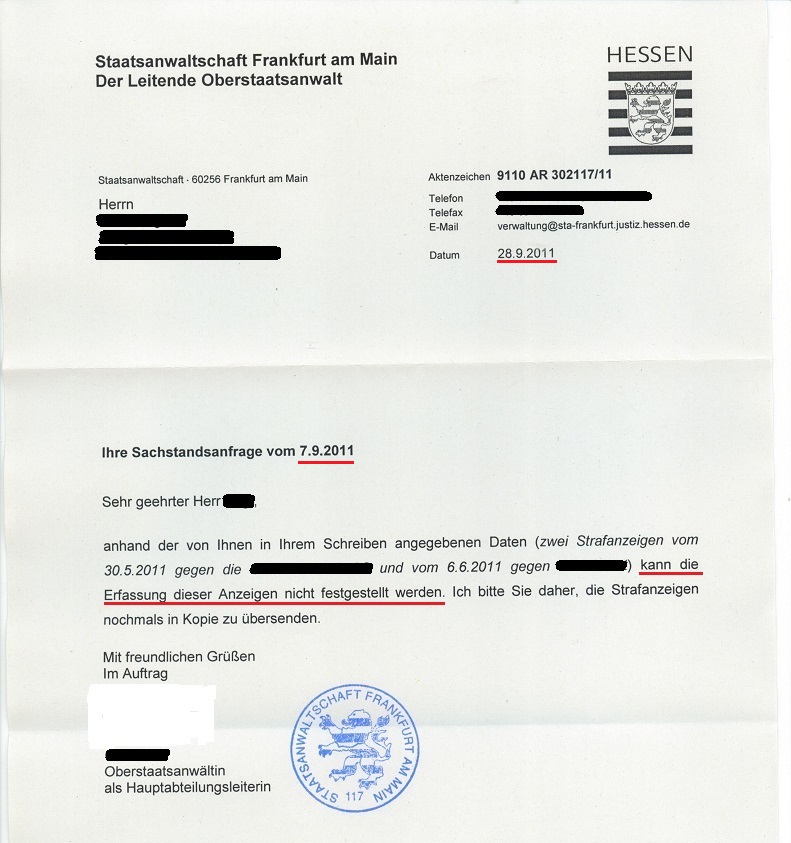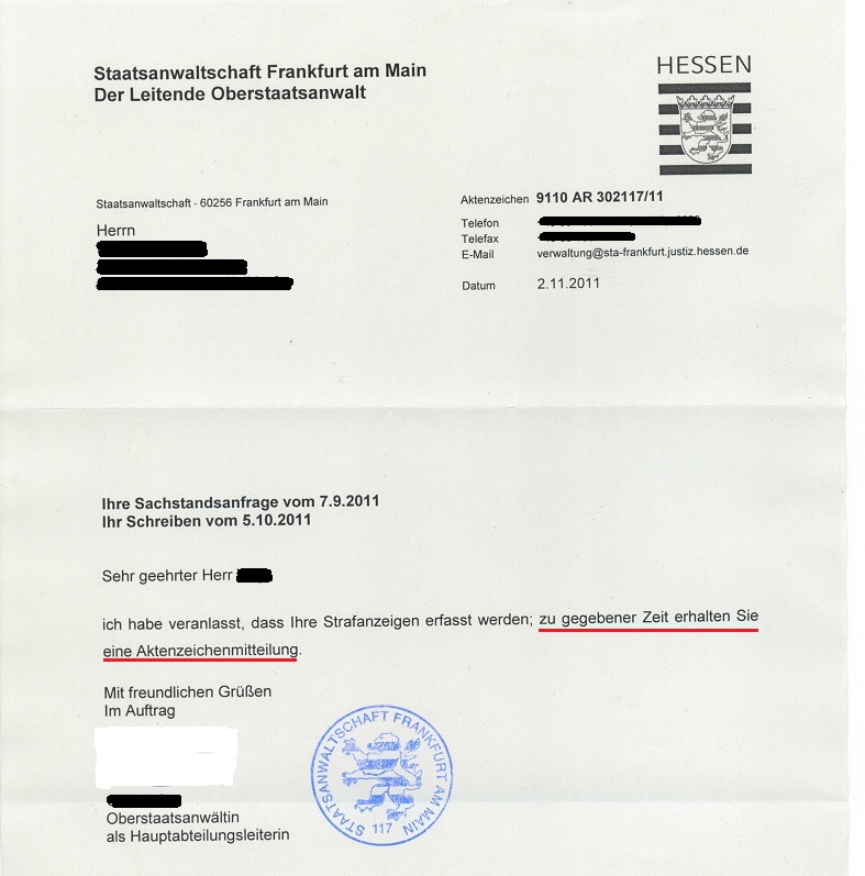 Schreiben an die Staatsanwaltschaft vom 25.10.2011