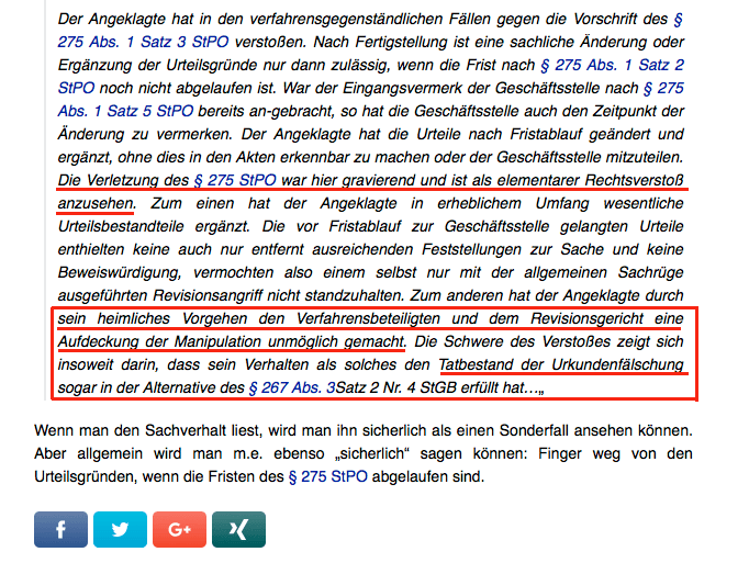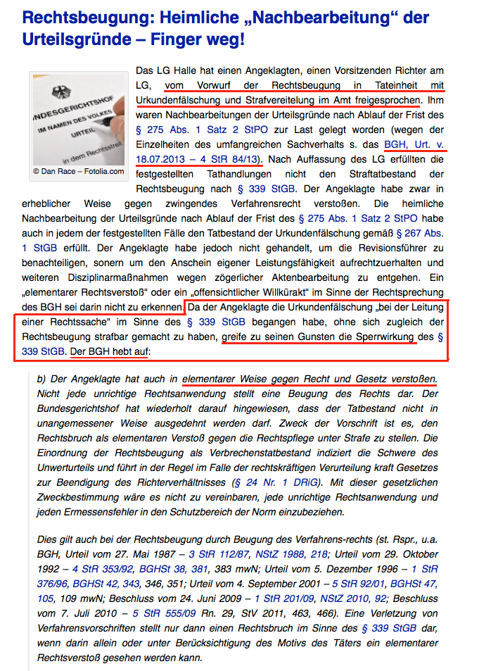 Der Artikel bezieht sich auf dieses BGH-Urteil mit Aktenzeichen 4 StR 84/13, in dem die hier geschilderte Urkundenfälschung als Rechtsbeugung erkannt wird, weil sie bei der Leitung einer Rechtssache im Sinne des § 339 StGB begangen wurde.
