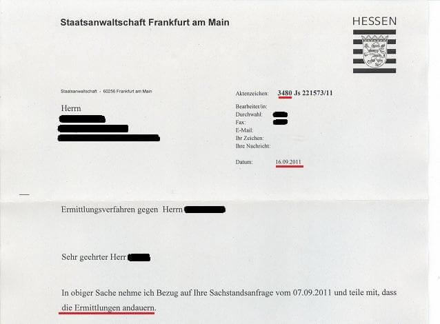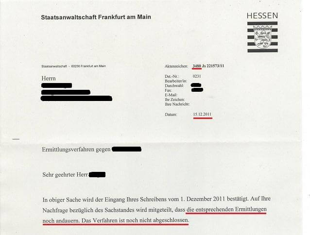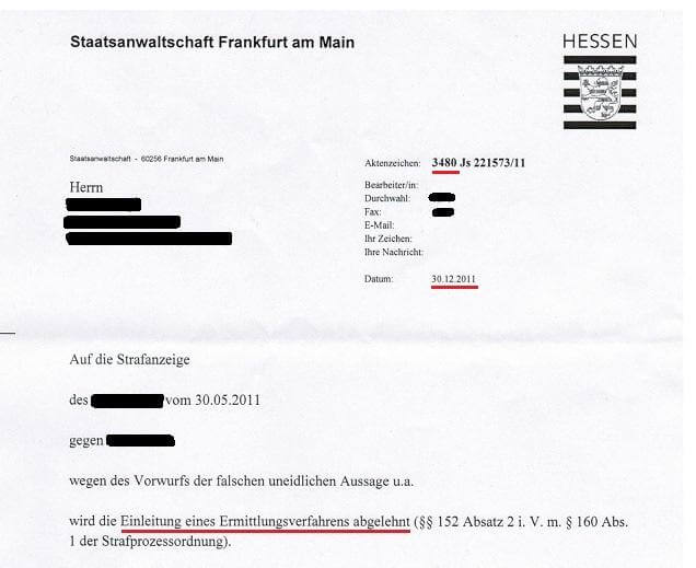 Am 30.12.2011 wurde die Einleitung eines noch andauernden und nicht abgeschlossenen Ermittlungsverfahrens abgelehnt: